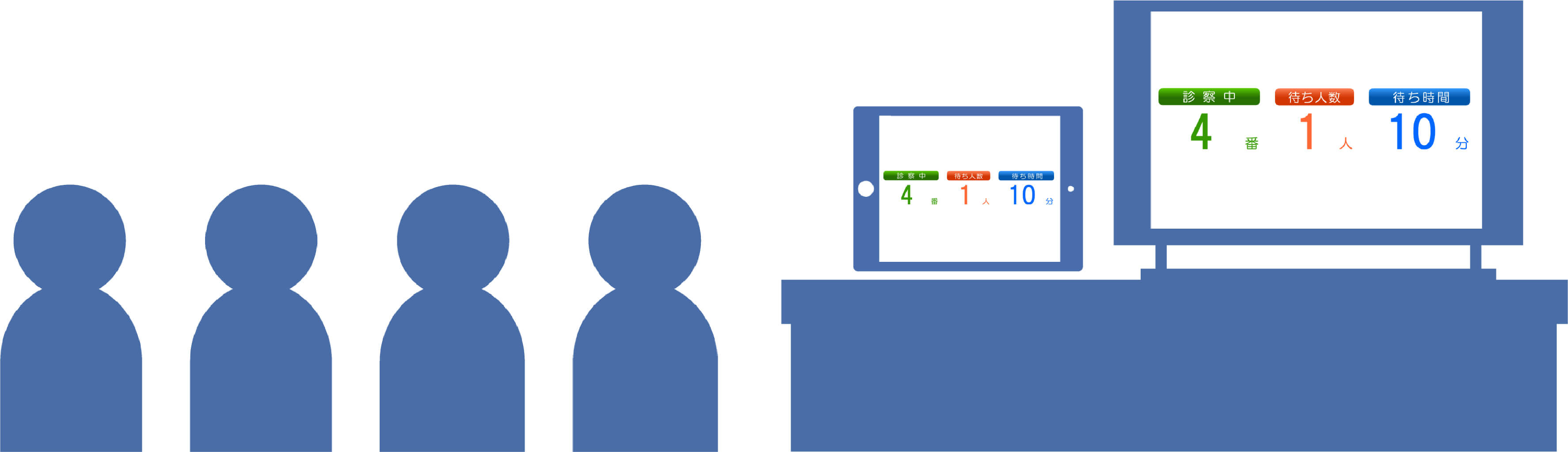 院内表示用のモニターやタブレットを設置すれば、待ち人数・待ち時間を院内の患者さんも確認できます。